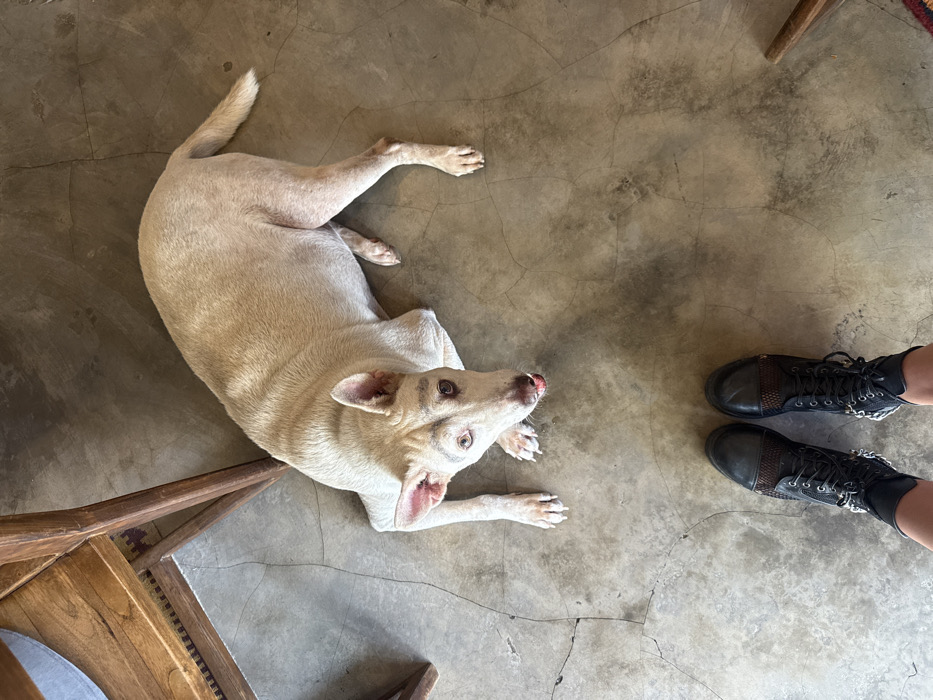 A light-colored dog lies on a concrete floor, looking up toward the viewer