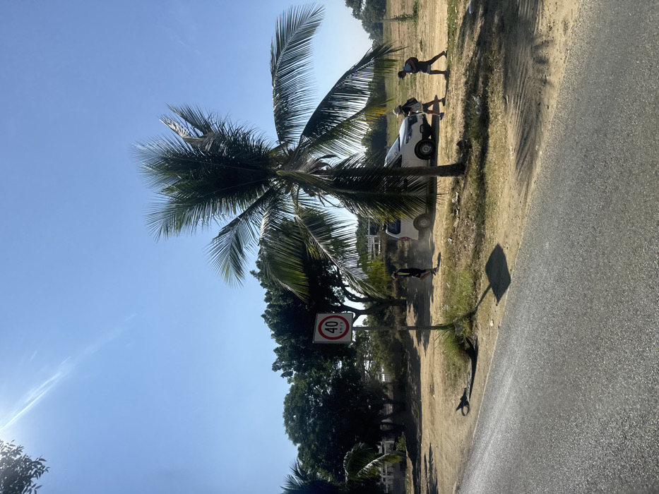 A palm tree stands beside a road with a 40 km/h speed limit sign. People are near a white car parked on a dirt area adjacent to the road. The sky is bright blue. The scene is sunlit, casting shadows from the palm tree and the speed limit sign. Lush green trees are visible in the background.
