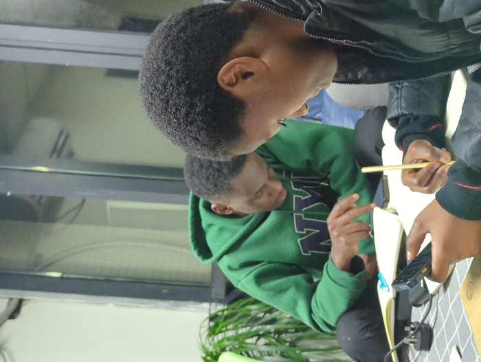The image depicts an indoor setting with two dark-skinned individuals, presumably male, engaged in focused activity at a table