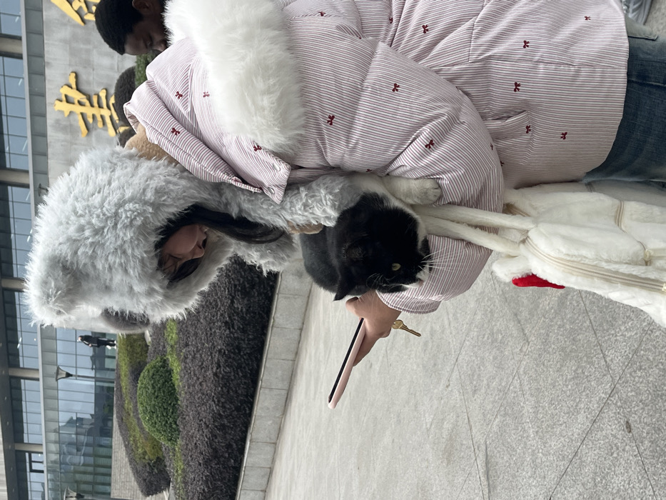 A person wearing a fur-lined hood and a striped coat with fur trim holds a black and white cat. The cat rests in the crook of the person's arm. The person also holds a phone and a key. In the background, there's a building and some landscaping featuring shrubs. The photo has a slightly blurred appearance, possibly due to motion or focus. The scene appears to be outdoors, on a paved surface.