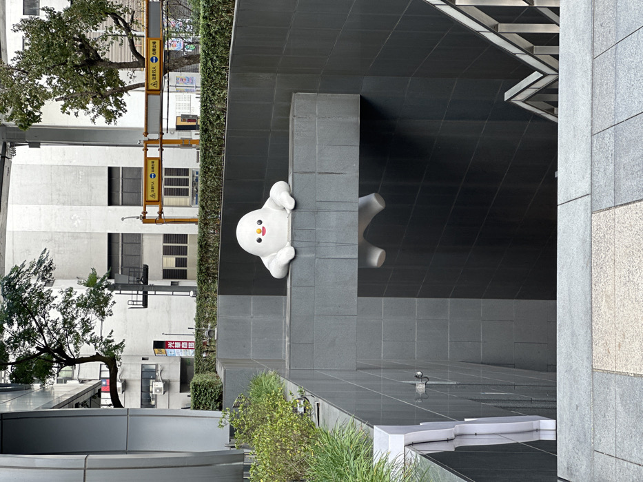 A white cartoon-like sculpture clings to a gray tiled wall. The figure has a round head with simple facial features and two arms extending over the wall's edge. Below, part of the sculpture extends in a shape that resembles limbs. The wall is part of a modern urban landscape with glossy black tile reflections and adjacent stone walkways. Buildings and greenery are visible in the background.