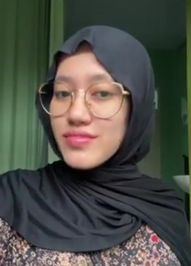 A young woman wearing a black hijab, a colorful patterned top, and round wire-frame glasses smiles at the camera. She has braces on her teeth, which are visible when she smiles. The background includes a light green curtain, a dark green door frame, and a white sink.