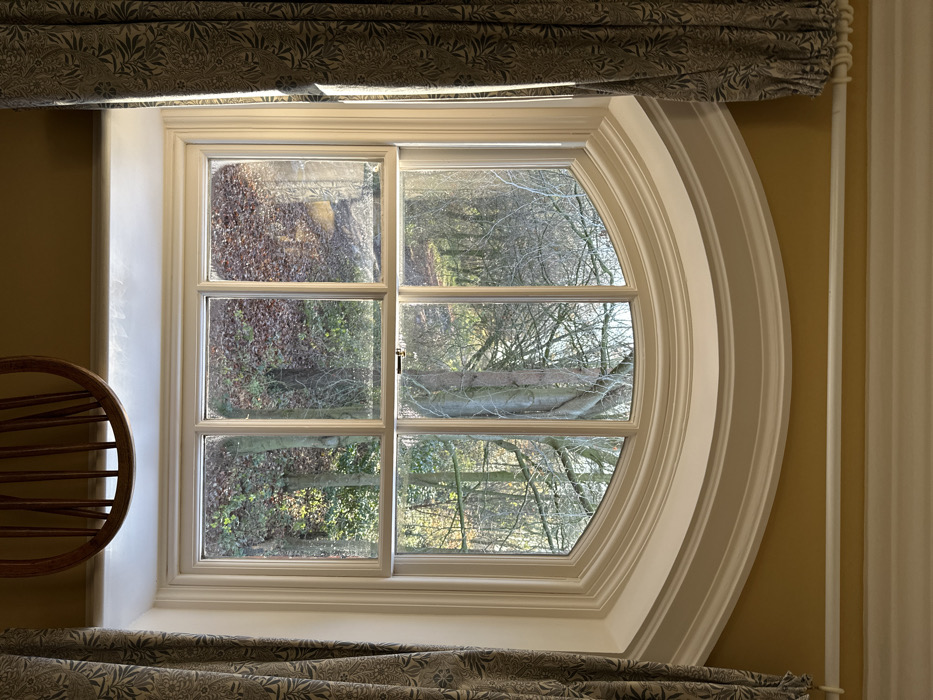 The image depicts an indoor view through a large, arched, multi-paned white sash window looking out onto a wooded area in Stafford, United Kingdom