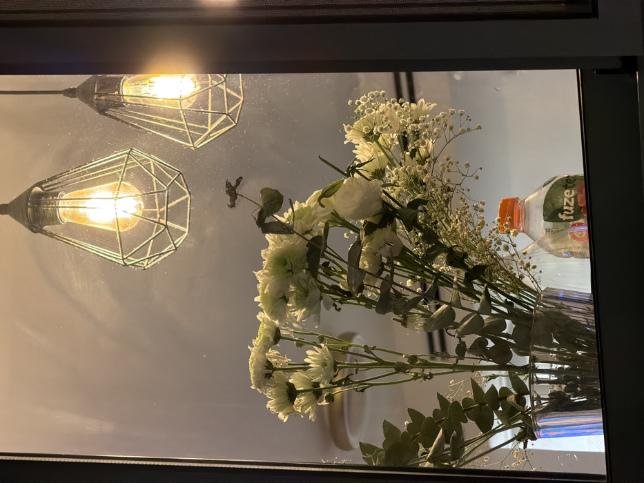 A reflective surface displays a bouquet of white flowers, seemingly in a vase, along with a Fuze Tea bottle. Two caged light bulbs hang overhead, their warm glow casting light onto the scene. The image is framed by a dark border, suggesting a window or mirror. The overall aesthetic is modern and slightly minimalist.