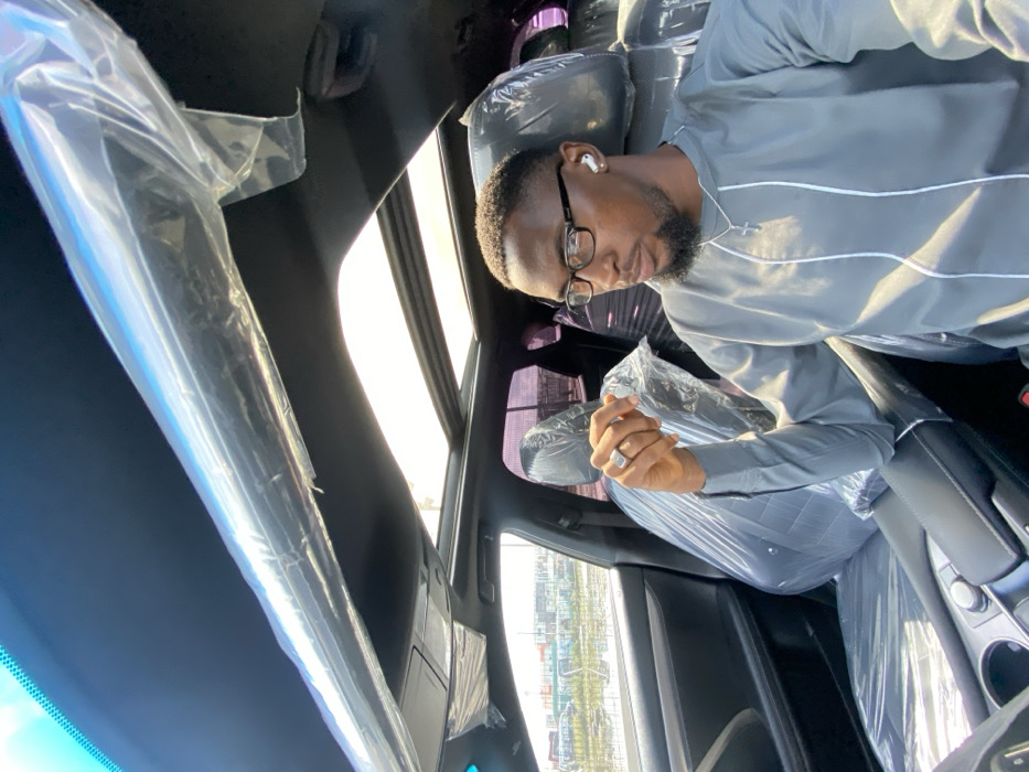 An adult male is seated in the driver's position of a stationary vehicle in Igboefon, Nigeria. He has short dark hair, a beard, wears black-framed glasses, a grey long-sleeved tunic with white vertical trim, a silver cross pendant, a silver ring on his right ring finger, and white wireless earbuds in both ears. His right hand rests on his left arm, and his gaze is directed slightly upward and to his right. The vehicle interior is black, with all visible seats, including the driver's and front passenger's, covered in clear protective plastic. A panoramic sunroof is visible overhead, and the windshield exhibits a blue tint. Through the front passenger window, a body of water is visible, with distant industrial structures or construction sites under a bright, clear sky.