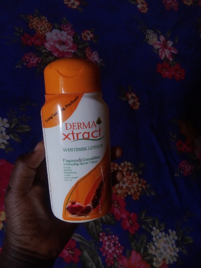 A dark-skinned hand holds a white plastic bottle of "DERMA xtract Whitening Lotion" with an orange flip-top cap