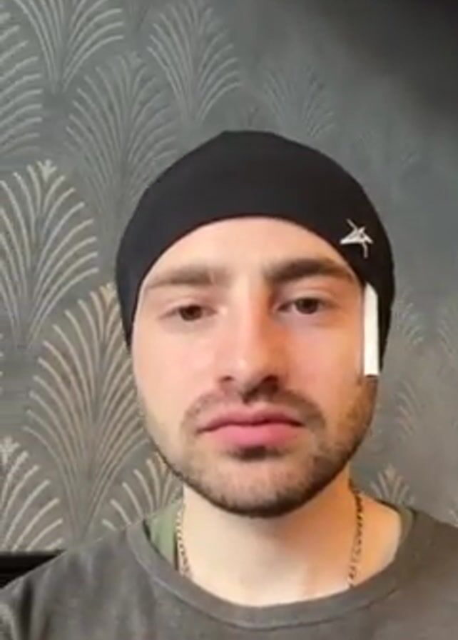 man wearing a black beanie with a logo, a gray shirt, and a silver chain