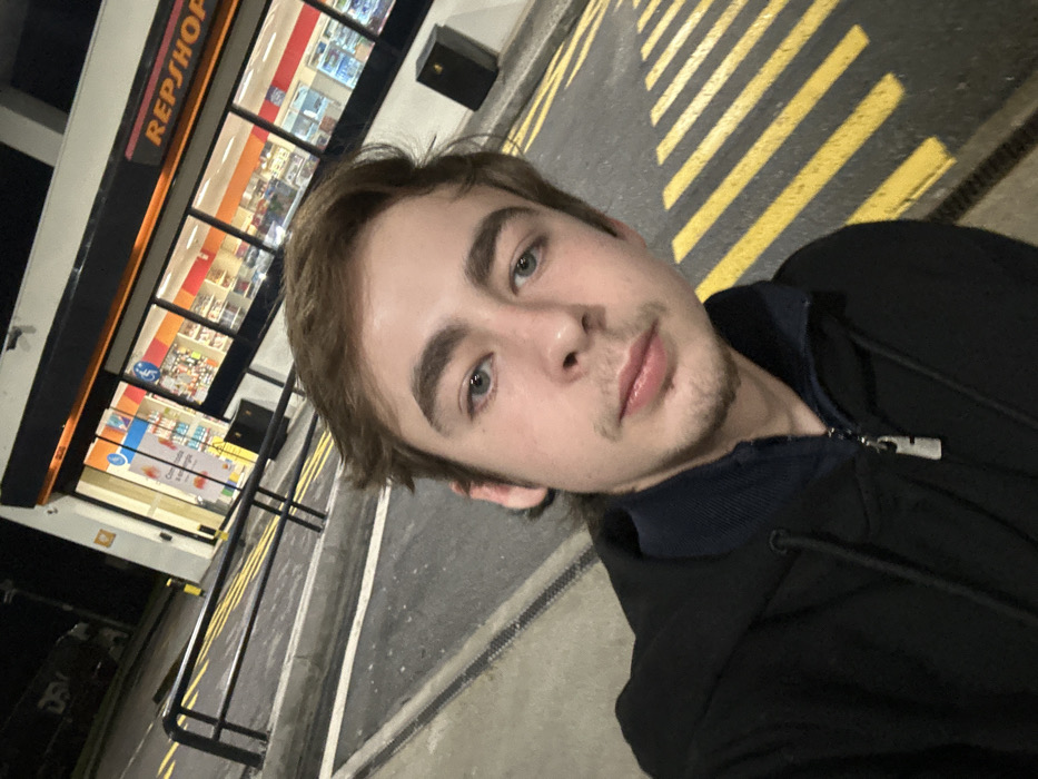 A young man with blue eyes and light brown hair poses for a selfie outdoors at night