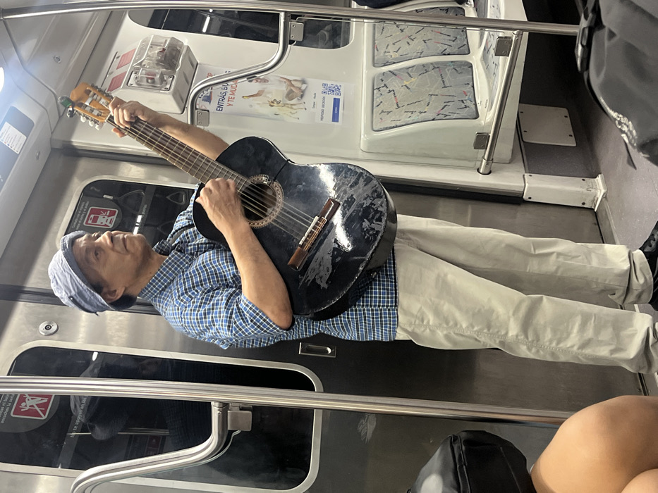 An elderly man wearing a blue and white checkered shirt, light tan pants, and a blue cap is sitting on a train. He is holding a black guitar. The train car has gray metal walls and white seats. A few other passengers are visible in the background. The overall lighting is bright.