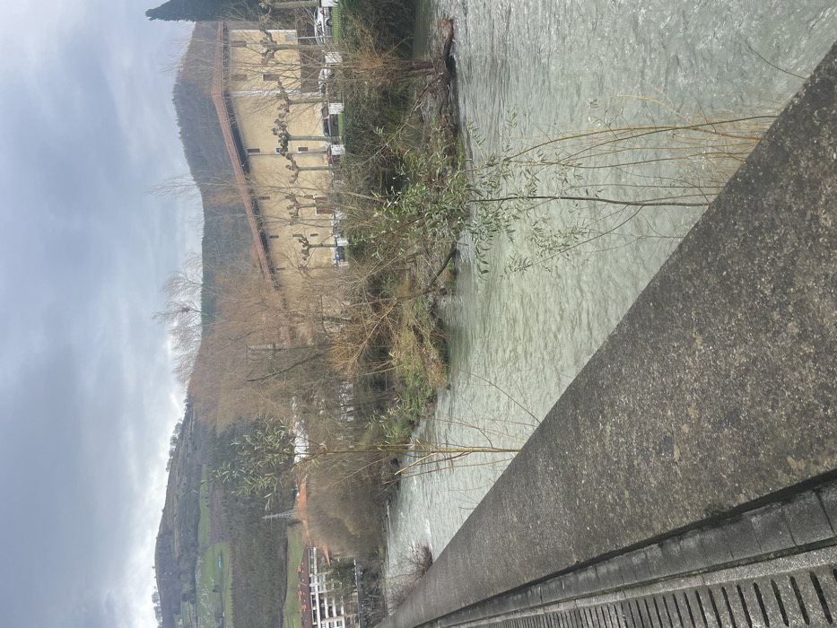The image depicts an overcast view across the Urola River in Azpeitia, Spain, from the perspective of a concrete bridge