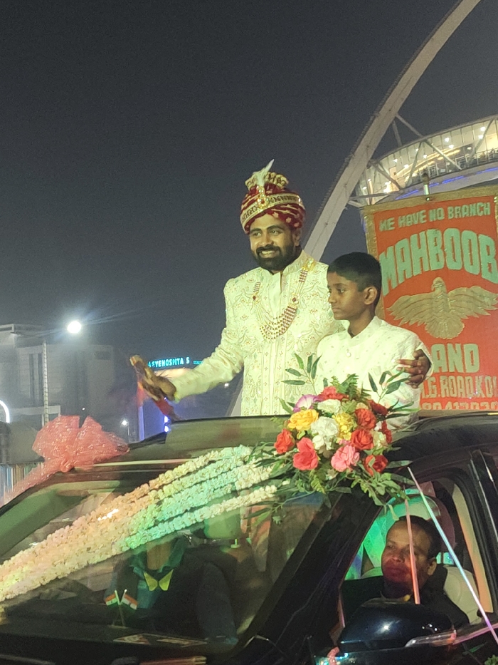 A groom in a decorated turban and traditional attire stands on a car, accompanied by a young boy dressed similarly. The car is adorned with flowers and garlands. A man is visible inside the car, possibly the driver. In the background, a banner with "MAHBOOB" is displayed, along with what appears to be an architectural structure and building. The event seems to be a wedding procession.