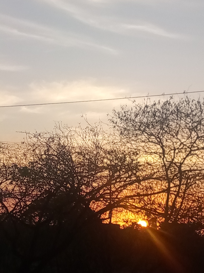 The image depicts a sunrise or sunset in Las Guevaras, Venezuela. The scene is dominated by a bright orange-yellow sun, partially obscured by the silhouetted canopy of multiple leafless or deciduous trees, positioned in the lower right quadrant. Strong lens flare emanates from the sun. The sky, occupying the upper two-thirds of the frame, transitions from pale orange near the horizon to light grey with wispy clouds at the top. A single dark utility line, likely a power line, extends horizontally across the mid-upper portion of the sky, situated above the tree line. No people, discernible actions, or other significant objects are present. The environment suggests an outdoor setting, potentially rural or suburban, characterized by natural light and overhead infrastructure.