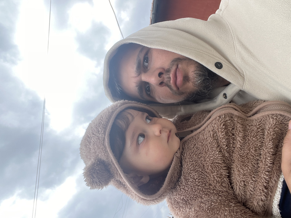 This image captures a close-up outdoor scene featuring an adult male holding an infant, located in Chirpan, Bulgaria