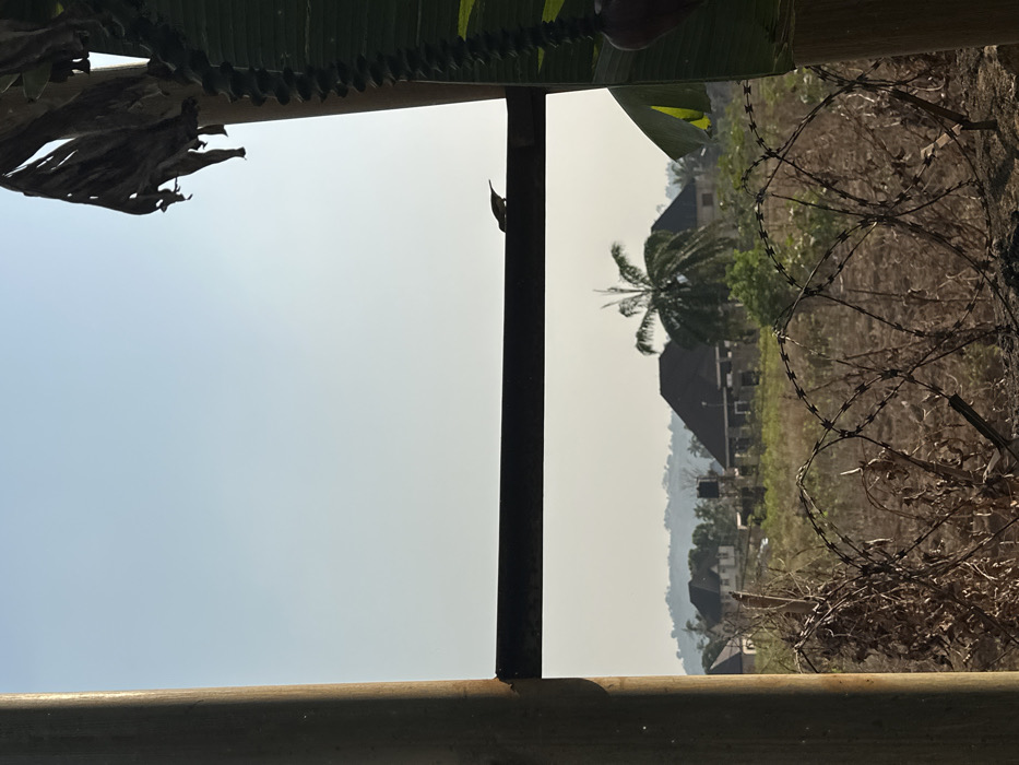 The image captures a daytime scene in Ozalla, Nigeria, looking out over a semi-developed landscape. In the immediate foreground, a weathered vertical pole frames the left side, mirroring a similar pole on the right, which is partially obscured by hanging, dried banana leaves and a stem with developing fruit. A dark, horizontal metal rail connects these two vertical structures, and a small, dark bird is perched on this rail, oriented towards the right. Below the rail, coiled razor wire lies on dry, sparse ground vegetation, indicating a boundary. In the middle ground, several residential structures with dark, sloped roofs are visible amidst scattered trees, including a prominent palm tree. One structure features an elevated water tank. The background consists of hazy distant hills under a clear, pale blue sky, characteristic of a dry season atmosphere. No individuals or direct human interactions are depicted.