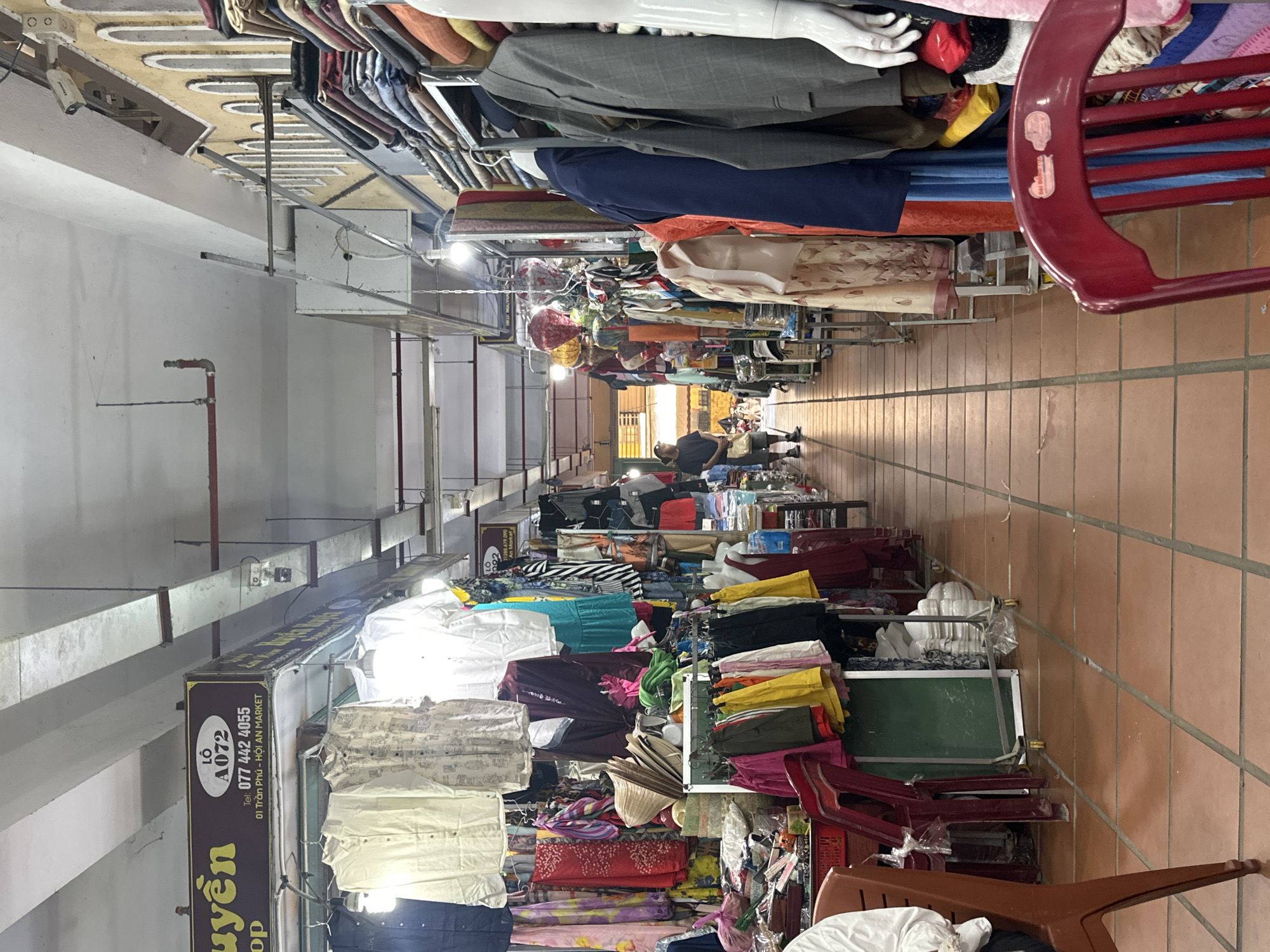 The image captures a commercial space, specifically a clothing market stall within the Hoi An Market in Hoi An Ward, Vietnam. A narrow passageway stretches into the distance, flanked by stalls overflowing with clothing items of various colors and textures. Garments are hung on racks overhead, extending from both sides, creating a cluttered yet organized display. The flooring consists of square tiles in a subdued tan color. On the left, a sign indicates the stall's location as "LÔ A072" and provides contact information. The overall impression is that of a busy and active retail environment.