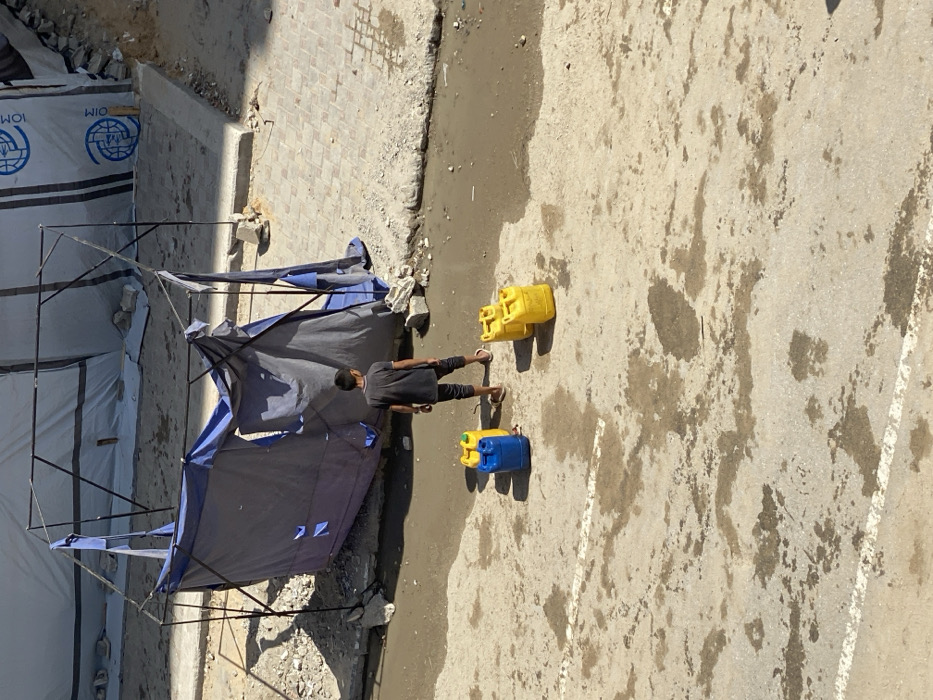 An elevated view captures a scene in al-Qarara, Palestinian Territory, under bright daylight. A young male, seen from behind, stands barefoot on a rough concrete or paved surface, facing away from the camera. He wears a dark t-shirt and dark pants. In front of him, scattered across the stained ground, are five plastic jerrycans: one blue and four yellow. Behind the boy, a makeshift structure stands on an unpaved, uneven surface with visible debris. This structure consists of a dark metal frame covered with torn and tattered blue and gray tarpaulin material. To the right of this structure, the ground transitions to a lighter, possibly tiled or paved area. Immediately in front of the makeshift structure and the boy, a significant patch of dark, muddy ground or stagnant dirty water is visible. In the background, behind the makeshift structure, large white canvas tents or shelters are visible. One prominent tent displays the blue "IOM UN MIGRATION" logo. The ground in the foreground shows numerous dark, irregular stains and two faint, parallel white lines, possibly faded road markings. Shadows indicate direct overhead sunlight.