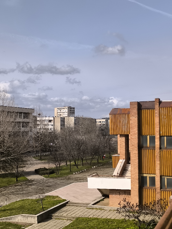 This image captures an urban landscape in Sliven, Bulgaria, on an overcast day with patches of blue sky. The scene is devoid of human presence. In the foreground, to the right, a multi-story building constructed with red brickwork and featuring prominent vertical aged wooden slats on its facade is partially visible. This building exhibits multiple rectangular windows with dark frames. A white concrete balcony structure with an integrated set of stairs, also white concrete, protrudes from the building's side. Faint black graffiti marks are visible on the brick wall below this balcony. To the left foreground, a gently sloped grassy area with concrete retaining walls and patterned paving stones is present. A small, dark-leafed bush is situated in the extreme bottom right corner. The midground features a park-like area with numerous deciduous trees, currently bare of leaves, consistent with late winter or early spring. Paved walkways, made of irregular stone or concrete slabs, wind through this green space. The ground is covered with green grass and some patches of visible soil. In the background, a cluster of multi-story apartment buildings, typical of socialist-era architecture, dominates the skyline. These buildings are predominantly light grey or beige. A taller, more prominent building with multiple open balconies stands centrally in the background. Small, dark specks, identified as birds, are seen flying near this central tall building. The sky occupies the upper portion of the image, presenting a mix of light blue areas and scattered, unevenly distributed grey clouds. A faint, thin white contrail stretches diagonally across the upper right quadrant of the sky.