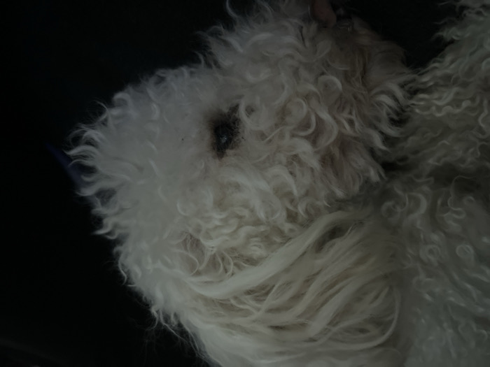 The scene is set in Varna, Bulgaria. The image depicts a white, curly-haired dog, likely a poodle or bichon frise type breed, positioned with its head oriented downwards and slightly to the right within the frame. The dog's dense, off-white to cream-colored fur covers most of its visible upper body and head. One dark eye is partially visible on the right side of the head, showing some periorbital staining. A faint blue object, consistent with a collar or harness, is discernible near the dog's right ear/neck area. The background is uniformly dark, appearing black, providing no additional environmental context or objects. No people or overt actions are visible; the dog appears to be still or resting.