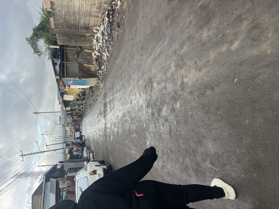 The image displays a street scene within Ongata Rongai ward, Kenya, under an overcast sky. In the foreground, the back of an individual wearing a black long-sleeved top, black pants with a pink accent on the right rear pocket, and white clogs is captured, moving away from the viewer. The ground consists of an unpaved, muddy dirt road marked with tire tracks and standing puddles. On the left side of the street, a white station wagon is parked, facing away from the camera, with its rear window partially obscured by a white element. Behind the vehicle, a line of single-story structures made from corrugated metal and other mixed materials extends into the distance, accompanied by numerous utility poles supporting a dense network of overhead electrical and communication wires. A large metal lattice tower is visible further down the street on the left. The right side of the street is bordered by a continuous row of predominantly corrugated metal shacks, some featuring colorful painted sections. Immediately adjacent to the road on the right, a substantial pile of accumulated refuse, including plastic, paper, and general debris, is visible against a grey concrete block wall. Green foliage is discernible above and behind the structures and wall on this side. Further down the street, multiple people are present, engaged in various activities, and several motorcycles are parked or in transit. The street diminishes into the background, flanked by additional informal structures and human activity, characterizing a busy, densely populated urban environment with evident waste accumulation.