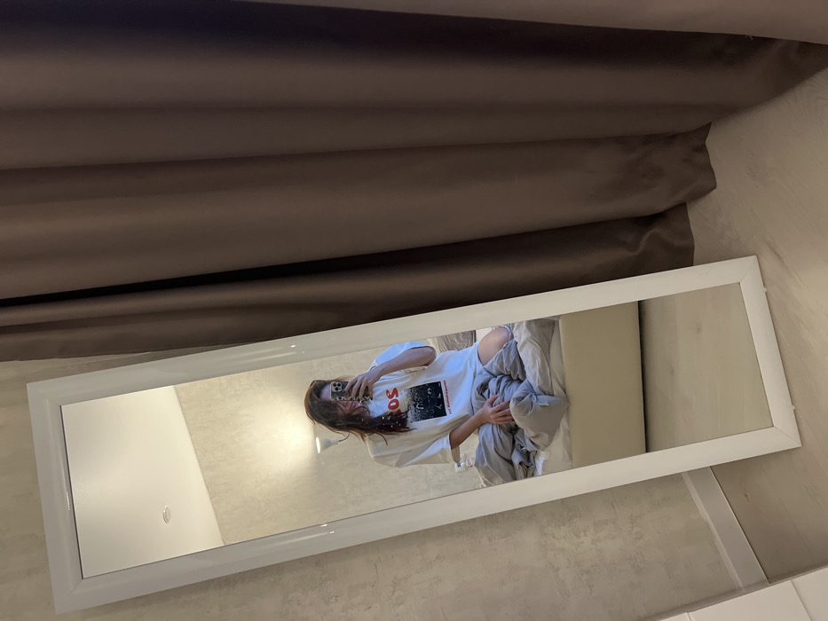 The image displays an interior room, presumed to be within Mytishchi, Russia, captured as a mirror selfie. A female individual with long, dark hair is reflected in a white-framed, full-length mirror, positioned at a slight tilt. She is seated or kneeling on a bed, wearing an oversized white t-shirt with a graphic design featuring red "SOS" text above a dark image and additional smaller text. Her bare legs are visible. The individual holds a dark-colored smartphone in her right hand, directed towards the mirror to take the photograph. The bed features a light-colored frame and headboard, covered with disheveled light grey bedding. The background reveals a light-textured wall with a white, wall-mounted lamp providing illumination. To the right of the mirror, heavy, dark brown curtains hang, extending to a light-colored floor where a white baseboard runs along the wall.