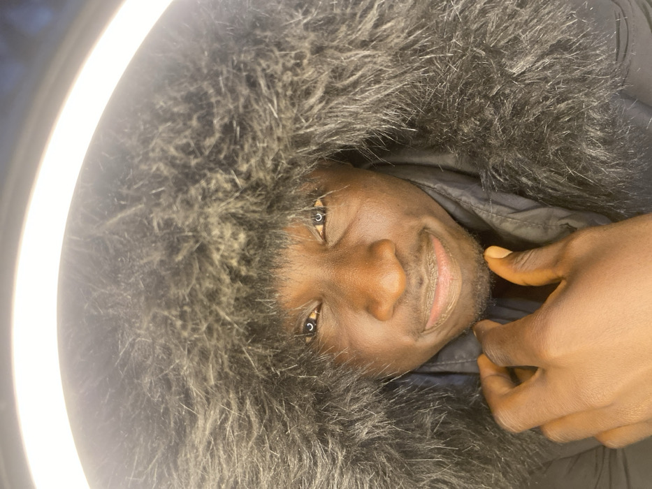 A dark-skinned male individual is depicted in a close-up, chest-up portrait, presumably taken in Narayi, Nigeria. He is wearing a dark jacket with a prominent, dark fur-lined hood that frames his face. The fur appears matted, with varied shades of dark grey and lighter tips. The subject's dark eyes are open, reflecting a distinct circular white light source, consistent with a ring light positioned directly in front of and above him. His lips are slightly parted, forming a subtle smile. Faint facial hair is visible on his chin. His right hand, with fingers slightly curled, is positioned near his chin/jawline area. The immediate background is uniformly bright, indicating an artificial lighting setup with no discernible environmental details.