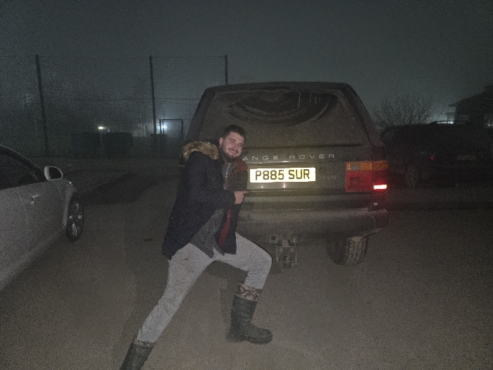The image portrays a nighttime outdoor scene in Cherven Bryag, Bulgaria. A male subject with a beard and a smiling expression is positioned centrally in a dynamic, crouched pose. He wears a dark winter jacket with a fur-lined hood, a grey shirt, grey pants, and dark tall boots with a visible pattern on the upper calf. His left hand rests near the rear bumper of a dark-colored, visibly dirty or dusty Range Rover, model 2.5 DSE. The Range Rover's illuminated UK license plate, "P885 SUR," is clearly visible, as is its illuminated lower right taillight and a rear tow hitch. A portion of a white sedan or hatchback with alloy wheels is partially visible on the far left. The background is dark and indistinct, featuring faint distant lights, vertical elements resembling fencing, and shadowed vegetation or structures. The ground appears unpaved or irregularly surfaced.