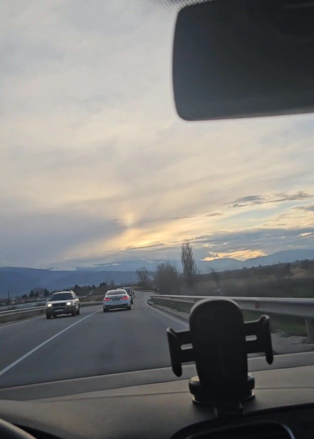 A static shot from inside a car driving on a multi-lane road at sunset or sunrise. Other vehicles are on the road. Mountains are visible in the distance under a cloudy sky. A phone holder is attached to the dashboard. A rearview mirror is visible. The steering wheel is visible on the left. A section of the car's sun visor with a dot pattern is also visible. The sound of music is audible.