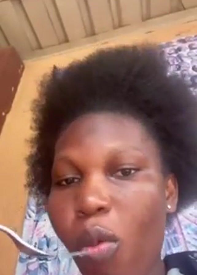 A woman with short, dark curly hair is looking into the camera as she eats food from a fork. She is wearing a floral shirt. Behind her is a window with a patterned curtain. The room is partially visible with a brown piece of furniture and a corrugated white ceiling. The woman brings the fork to her mouth, chews and swallows the food, and then looks directly at the camera again.