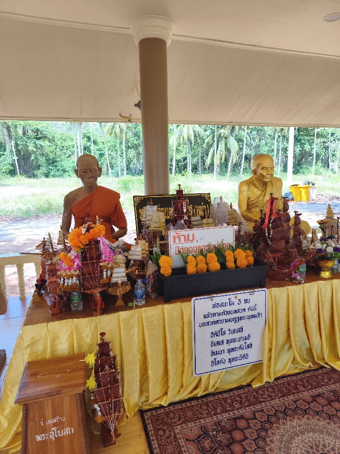 An outdoor altar displays statues of monks, one in a maroon robe and another in gold. Decorated model ships sit on the table, accompanied by flowers and water bottles. Signs in Thai script are posted: one stating "H̄̂ām" (prohibited), another advertising construction of a "Phra Ubosot" (main temple building), and the third with the prayer "T̄h̀xng nāmô 3 k̄hb". Orange flowers line a black planter. A decorated wooden donation box sits to the left of the altar. The scene is set with lush tropical foliage in the background.