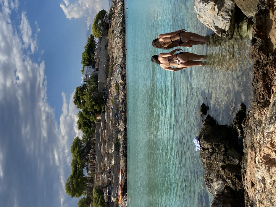 This image captures a coastal scene in Megalochori, Greece, under a partly cloudy sky. The foreground features two adult females, viewed from behind, standing in clear, turquoise water that reaches approximately mid-thigh. The female on the left wears a dark-colored string bikini with a thong bottom and has dark, shoulder-length hair. The female on the right also wears a dark-colored string bikini with a thong bottom and has longer, dark, curly hair. Both are facing away from the viewer, seemingly observing the water or distant scene. The immediate shoreline consists of dark brown and tan rocks; a white piece of fabric is draped over a rock on the left side. The water's clarity allows visibility of the rocky bottom in the shallow areas. In the background, a rocky hillside rises, populated with numerous straw-thatched beach umbrellas, suggesting a structured recreational area. Scattered green trees cover parts of the hill, and several buildings, including a prominent white structure, are visible among the foliage at the hill's crest. Along the background shoreline, multiple small watercraft, appearing to be kayaks or paddleboards, are beached on the left. The sky above is a mix of clear blue and white cumulus clouds, with some darker grey cloud formations on the left.
