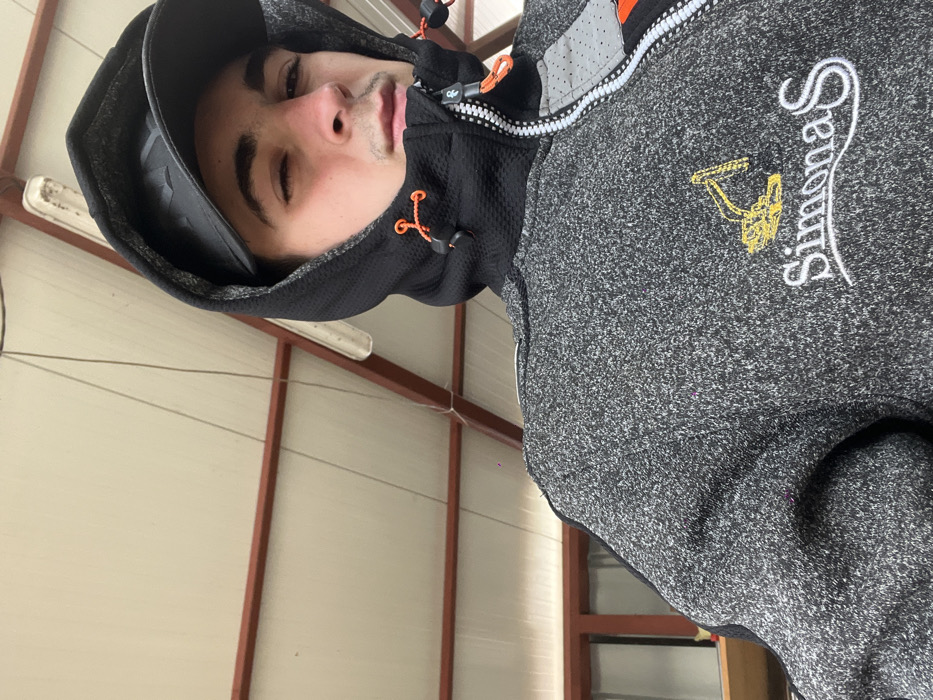 A male individual, appearing to be a young adult, is depicted in a close-up portrait, looking directly at the camera. He has fair skin, dark hair, and a short mustache. He is wearing a black baseball cap under a black hooded jacket with the hood pulled up. The jacket is dark gray with a heathered texture, featuring a prominent silver zipper with a gray textured panel and orange drawstring toggles. An embroidered logo on the left chest displays a yellow excavator above the word "SimonaS" in white script. The background shows an indoor setting with a light-colored, possibly corrugated, ceiling supported by reddish-brown metal beams. A partially visible fluorescent light fixture and wires are present on the left side of the frame. The specific location in the city of Unknown, Unknown, cannot be determined from the image, but the environment suggests an industrial or utility building setting.