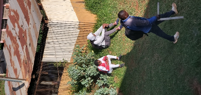Three people are outside on green grass. One is wearing a blue shirt and dark pants and holding a right-angle metal object on the ground. Another person wears a gray hoodie with dark pants and a backpack. The third person wears a white and red top with white pants. A building with a corrugated metal roof sits adjacent to a grassy area with foliage.