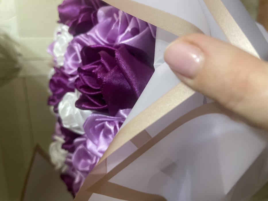 A close-up shot focuses on a floral arrangement of satin ribbon roses in shades of purple and white. The roses are densely packed, creating a textured, layered effect. The arrangement is wrapped in white paper with a tan ribbon accent. A human hand with a pale fingernail is partially visible, holding or adjusting the wrapping. The background is a muted, undefined space, directing attention to the floral bouquet.