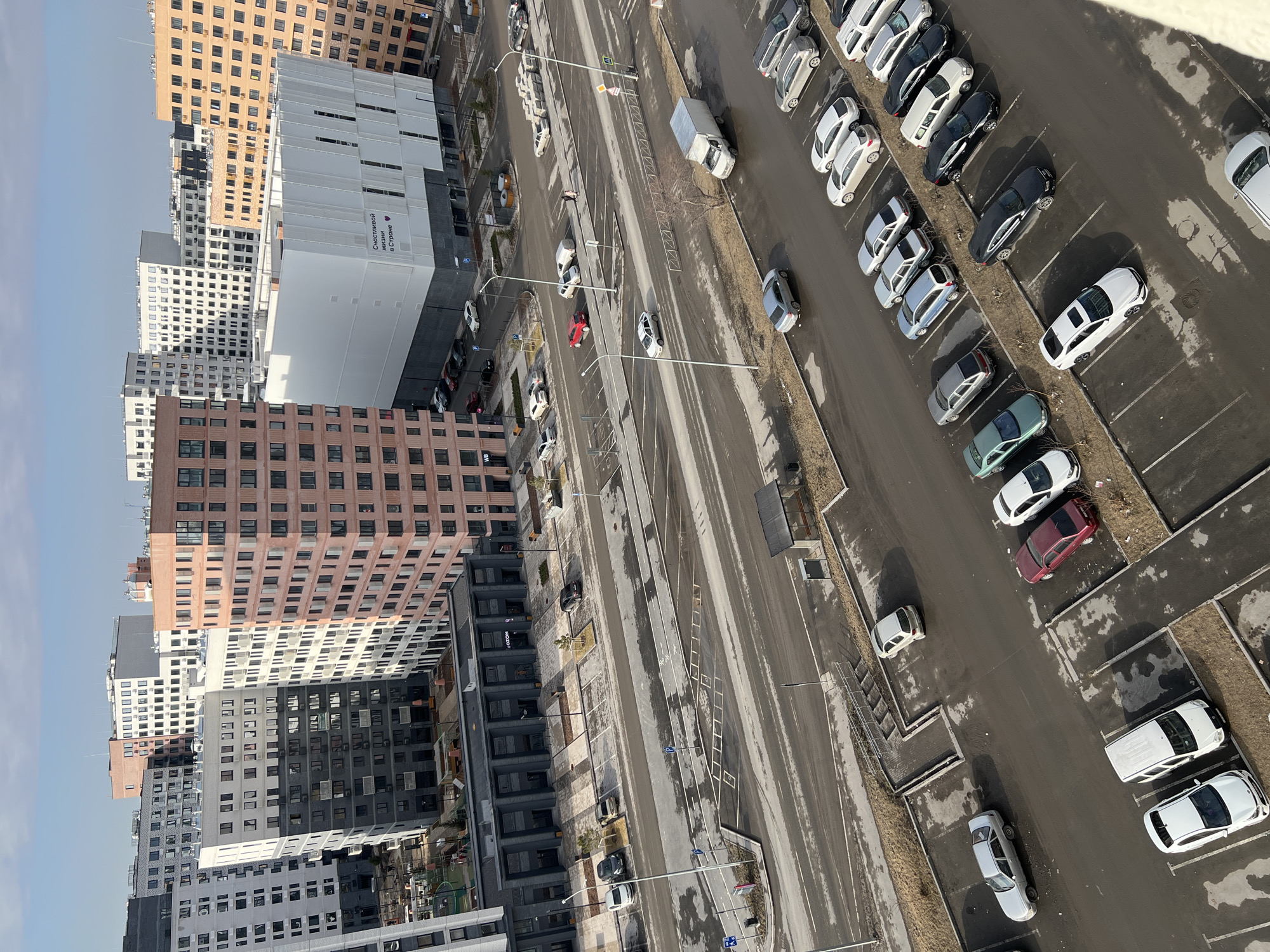 n aerial view of a parking lot and adjacent buildings in Tyumen, Russia. The parking lot is mostly full of various cars, arranged in rows. Adjacent to the parking lot is a multi-lane street, where a white van and other cars are moving. On the left side of the image, there are several high-rise buildings of different colors and architectural styles. The sky is overcast, casting a soft light over the scene. Overall, the image portrays a typical urban landscape with its infrastructure and buildings.