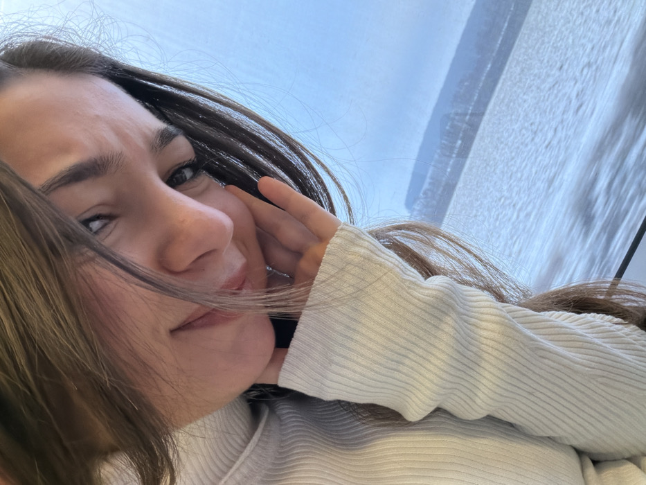 A close-up, angled photograph shows a young female with long brown hair and fair skin, looking directly at the viewer with a faint smile. Her right hand, with fingers curled, rests against her cheek. She is wearing a light-colored, ribbed turtleneck sweater. The background, visible through a window, depicts a body of water with a subtly rippled surface, backed by distant, undulating land or mountain formations under an overcast or light blue sky. This scene is located in Obermodern-Zutzendorf, France.