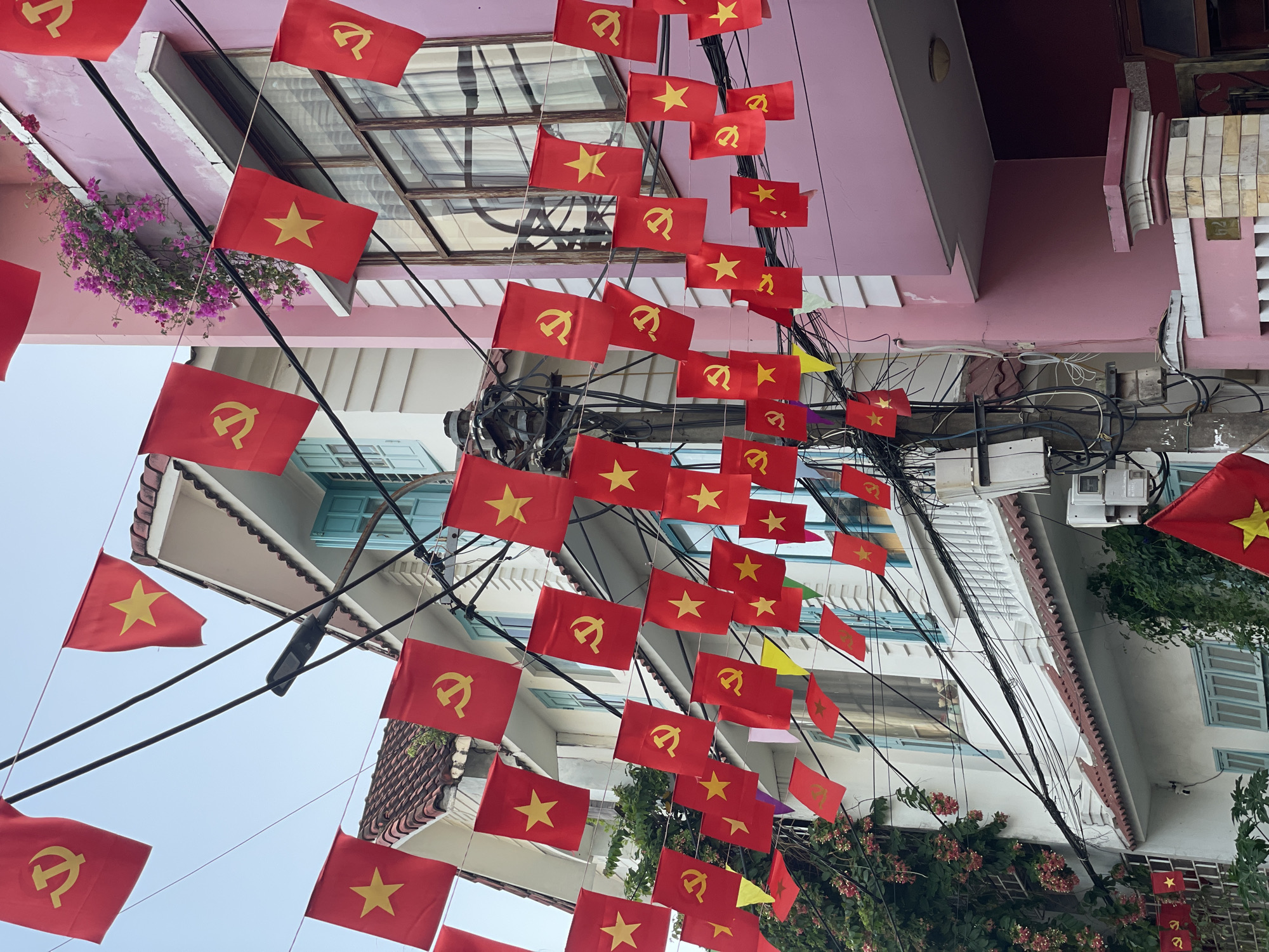 street scene in Đà Nẵng, Vietnam. Red flags bearing a gold star and hammer and sickle are strung between buildings and overhead wires. The buildings are multi-storied and painted in pastel colors. There is a blue sky.