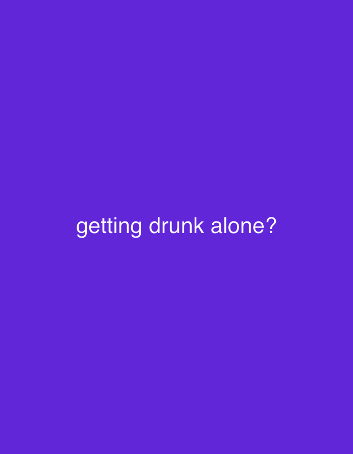 A solid purple background fills the frame. Centered and positioned towards the middle-lower portion is the text "getting drunk alone?" in a clean, sans-serif font. The text is white. The overall composition is simple and direct, using color and text to potentially evoke feelings of isolation or introspection.
