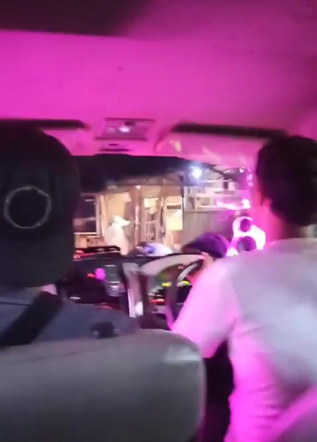 interior of a car at night, illuminated by a pink light. The camera is positioned in the backseat, facing forward. Two people are visible: the driver, wearing a white shirt, and a passenger in the front seat wearing a baseball cap. The car is driving through what appears to be a town at night, with streetlights and building lights visible through the windshield. The car's dashboard and interior details are partially visible. The overall atmosphere is somewhat dark due to the lighting conditions.