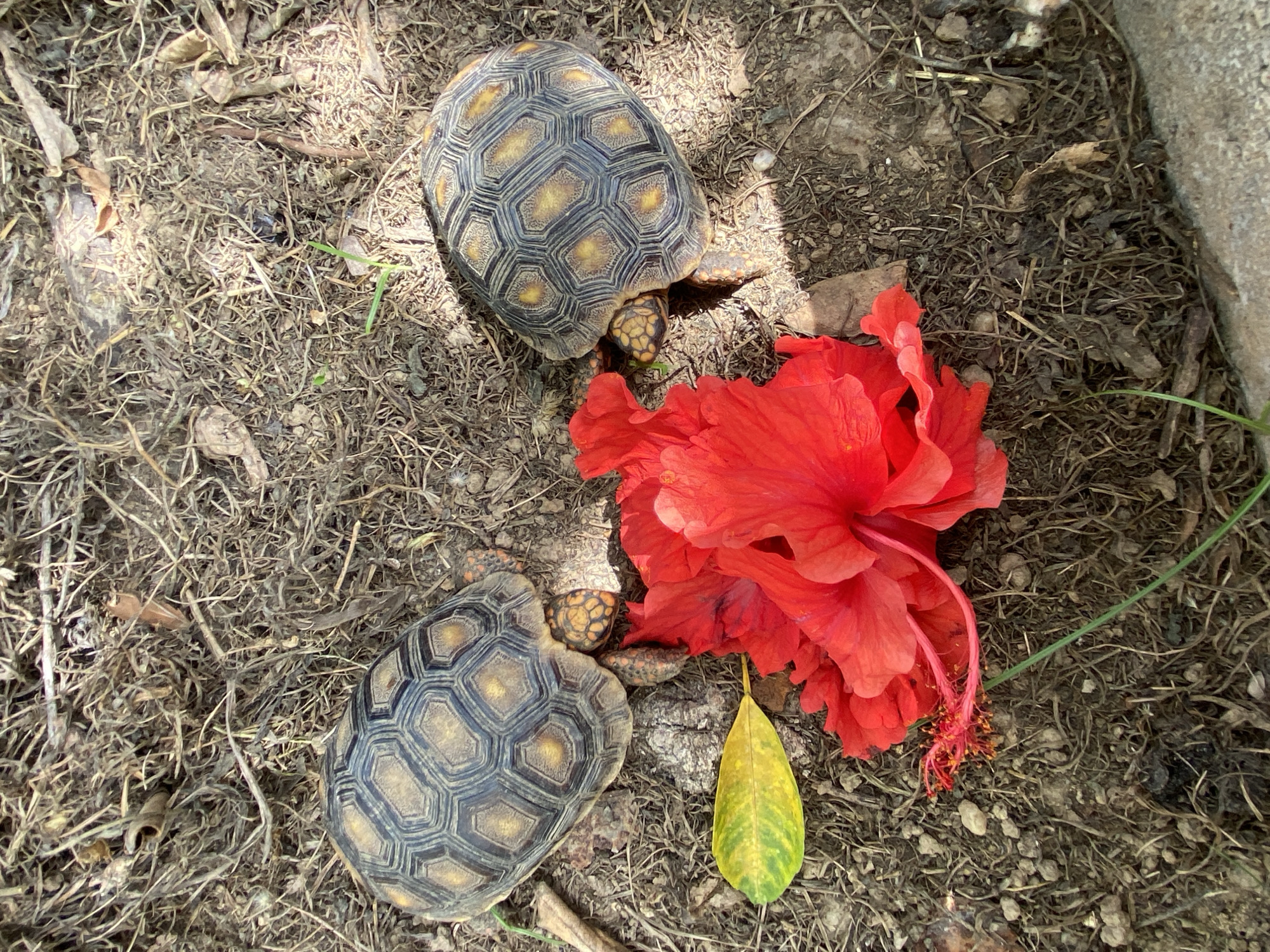 two tortoises on dirt ground covered with dry leaves and twigs, beside a large red hibiscus flower and a yellow leaf