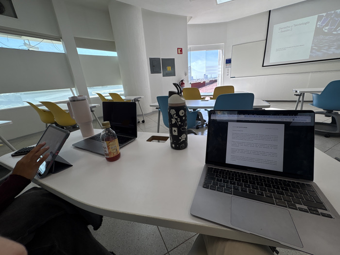 A classroom with several laptops and tablets scattered on a large, white table. A presentation screen displays the words "Derecho y Technologia". Large windows reveal a cityscape in the background. Various chairs are arranged around the room, some yellow and some blue. There's a bottle of liquid and a patterned water bottle on the table.
