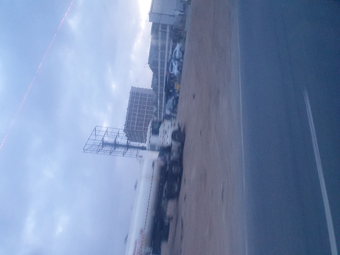 A blurred image shows a cityscape beside a road. Buildings of various sizes are visible, with one large, boxy building standing out. A tanker truck with a metal frame mounted on top is parked on the shoulder. The sky is overcast and bright, creating an overall hazy atmosphere. The road appears to be a highway, with lane markings visible.