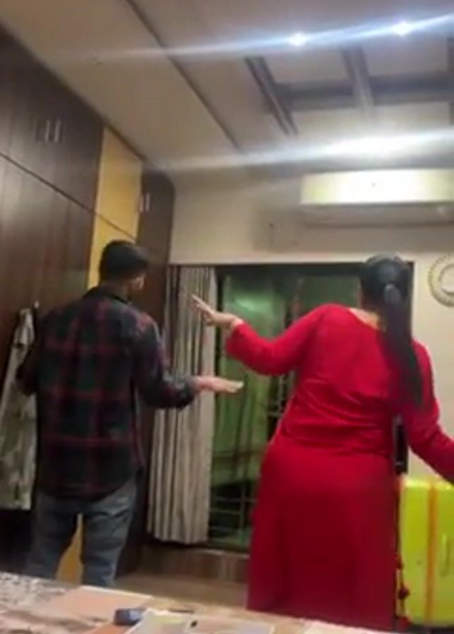 A man and a woman are standing in a room with their arms outstretched, mimicking airplane wings. The man is wearing a black and red plaid shirt and jeans. The woman is wearing a red dress. There is a yellow suitcase on the floor. The room has a wood floor and a ceiling fan. There is a large window in the background. A large wardrobe is against the left wall.