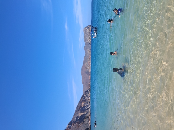 The scene depicts a daytime coastal environment in Unknown, Venezuela. The foreground features clear, shallow ocean water revealing a sandy bottom. Eight individuals are present in the water, engaged in swimming or wading activities. In the immediate foreground, two individuals are partially submerged; one, on the left, wears a dark long-sleeved shirt and faces right, while a smaller individual is positioned to their right. In the mid-ground, to the right of the central foreground figures, three additional individuals are visible in the water: one with dark hair is visible from the shoulders up, another wears a blue long-sleeved top and dark goggles, and a third is partially obscured behind them. Two more individuals are observable in the water in the far-left background, near the coastline. A small, white motorboat with a blue canopy is situated in the mid-ground water, positioned to the right of the main group of swimmers. The background consists of arid, rocky coastal mountains and hills under a clear blue sky with minimal cloud cover.