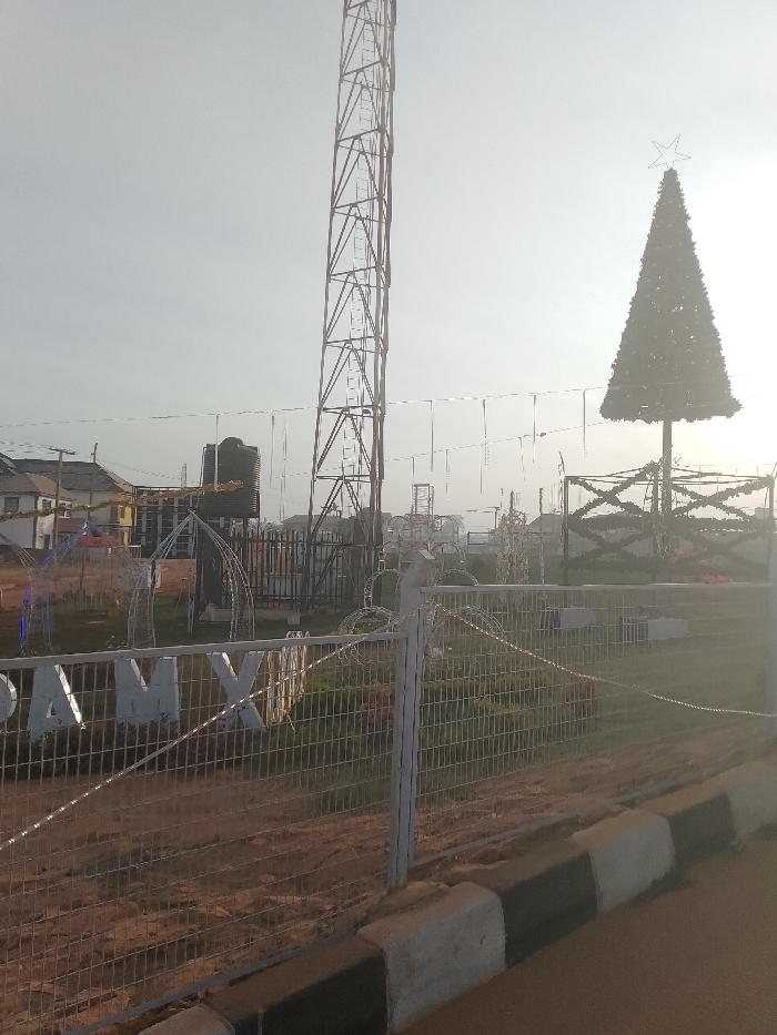 A tall radio tower and an illuminated Christmas tree with a star on top stand within a fenced area. Decorative arches and shapes are arranged in the space, adding to the festive atmosphere. A water tank is visible in the background near some buildings. The foreground shows a metal fence with a curb of alternating white and black colors. The letters "DAMX" are visible on a sign in the front.