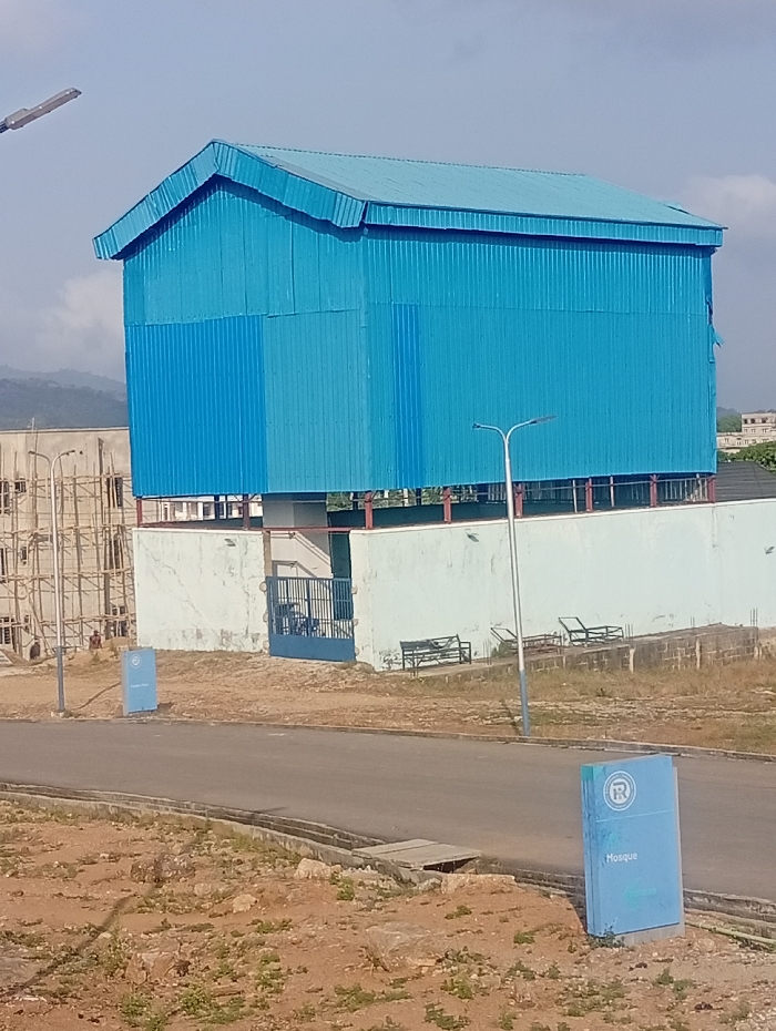 A blue metal building with a peaked roof sits atop a white concrete base, separated by an open area. A fence and a staircase are visible in the space between the building and the base. A street light stands in front of the building. Two blue signs are placed on the side of the street, one labeled "Mosque." In the background, there are buildings under construction and hills. The foreground consists of a paved road and patches of dirt with sparse vegetation.