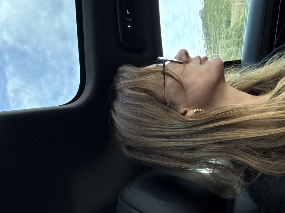 A female individual is observed in profile, facing right, situated within the passenger compartment of a moving vehicle. Her hair is light brown with highlights, styled with bangs. She wears glasses featuring brown tortoiseshell frames and a single gold-colored, ridged, C-shaped hoop earring on her visible right ear. Her attire includes a dark-colored top. The vehicle's interior presents black leather upholstery, seen on a headrest to the left, and a black overhead console equipped with a sunroof. Through the sunroof and the right-side window, a partially cloudy blue sky is visible. The overhead console also displays a panel containing two small indicator lights and two distinct control buttons. The external environment, viewed through the vehicle's side window, depicts a rolling, green landscape under a blue sky, with distant hills, scattered structures, and a small red-orange object discernible on the horizon. The landscape exhibits motion blur. This scene is located in Torres Vedras, Portugal.
