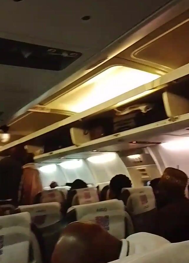 interior of an airplane cabin. Passengers are seated in rows of seats with the "AIICO" logo on the headrests. People are moving around, some are putting luggage in the overhead compartments. There are overhead lights and emergency exit signs visible. The camera seems to be moving or shaky.