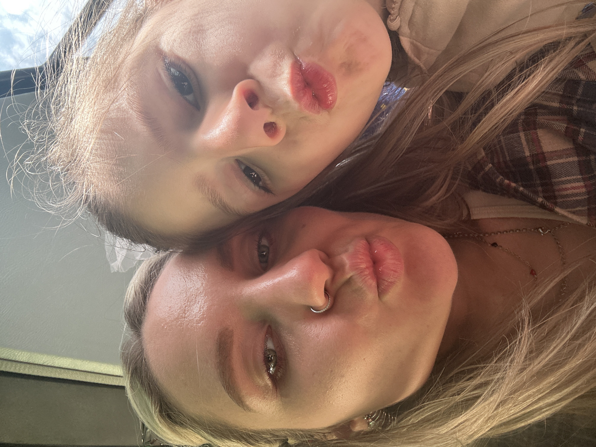 Two individuals, presumed to be a mother and child, are positioned close together, facing the camera at an unusual upward angle. Both are pursing their lips into a "kissing" expression. The child is situated at the top of the frame, while the woman is positioned at the bottom. The woman has blonde hair, a nose ring, and is wearing a necklace. The child has light brown hair. A plaid shirt is visible behind the woman. The environment appears to be indoors, potentially inside a vehicle, due to the angle of the shot and the presence of a window reflecting what seems to be sky. There is no definitive evidence to support the image being taken in Başakşehir, Turkey.
