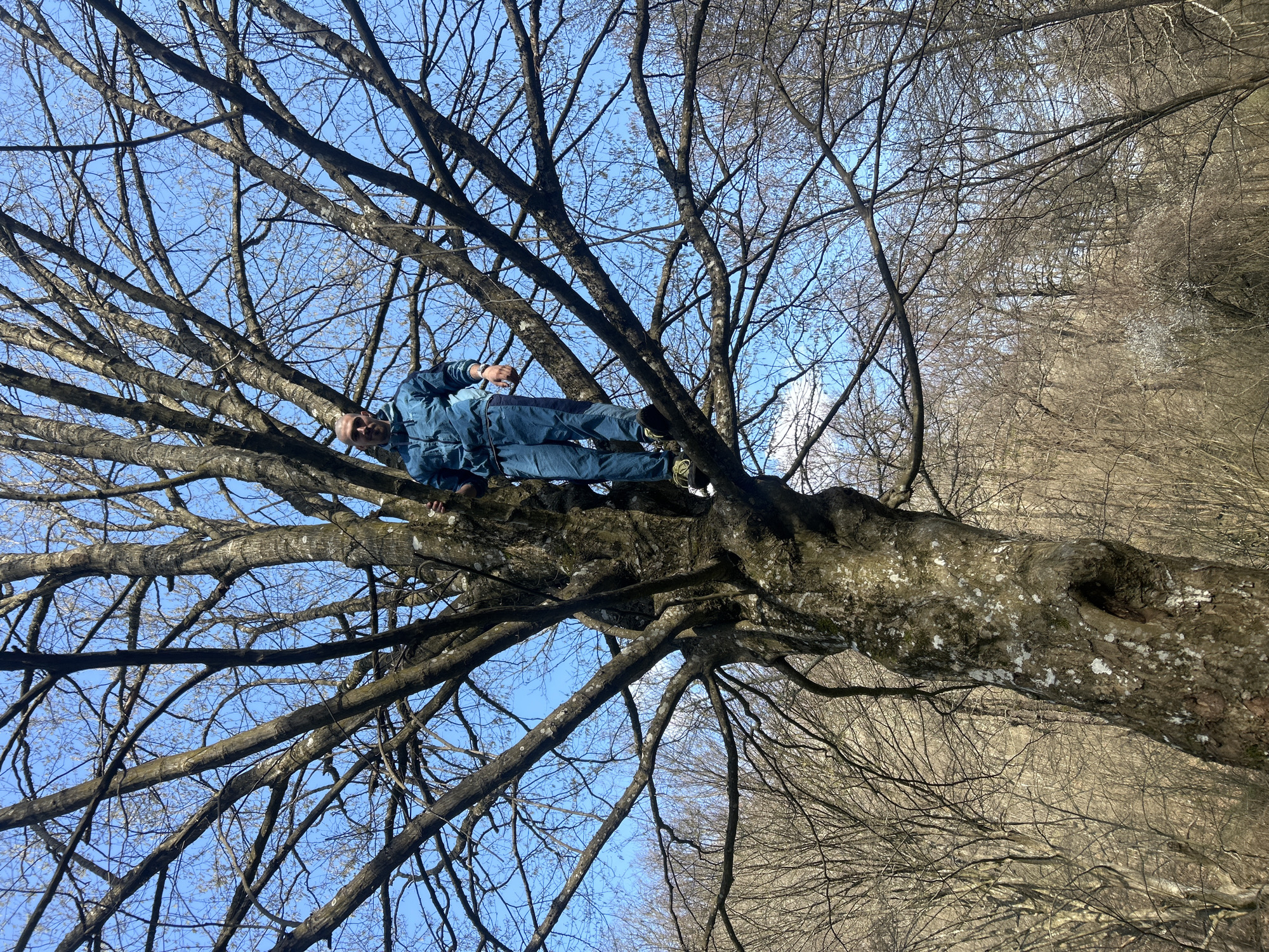 A man in denim clothing is lying on a thick tree branch in Mladezhko, Bulgaria. The tree is mostly bare of leaves, with many branches against a blue sky. Other bare trees are visible in the background.
