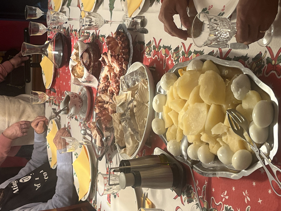 A festive table set with a red and white tablecloth displays a variety of dishes. Steaming potatoes and hard-boiled eggs dominate one tray, while another holds bacalhau, a traditional Portuguese dish of salted cod. A dish of octopus, bread in a basket, and an olive oil dispenser are also visible. People are gathered around, holding glasses, suggesting a shared meal and convivial atmosphere.
